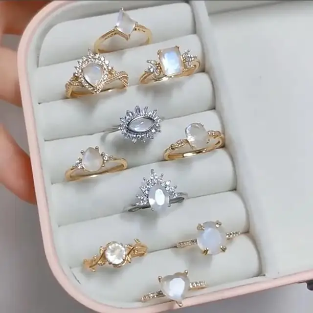 Wholesale Adjustable Fine Blue Moonstone Jewelry Gold Plated Silver Rings Women 925 Sterling Silver Rainbow Moonstone Ring